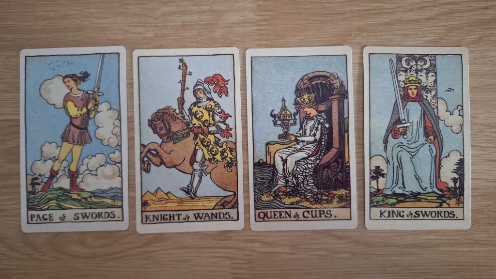Por otro lado, los arcanos menores están divididos como ya he dicho en 4 palos: bastos o varitas, espadas, pentáculos y copas.